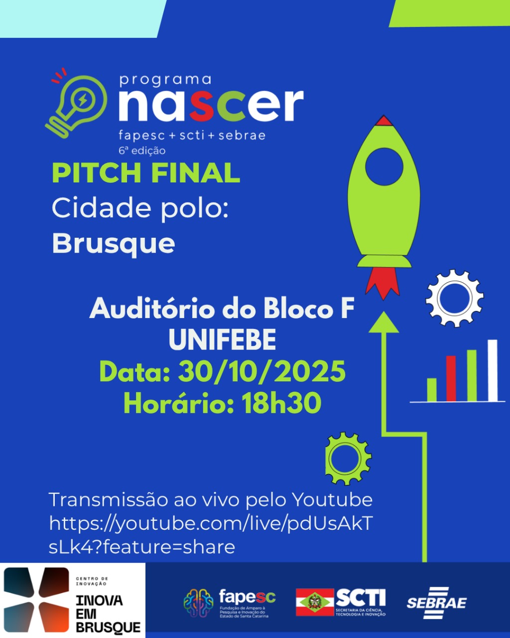 Pitch Day do Programa Nascer 6ª edição! Venha prestigiar e apoiar as ideias inovadoras que estão nascendo! Dia 30...VER EVENTO